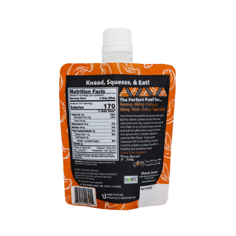 At Maisie Jane’s, food safety and allergen control are a top priority. We process almonds, cashews, walnuts, and hazelnuts in our own facility, and some equipment—like roasters and nut butter lines—is shared between them. To prevent cross-contamination, our team follows strict protocols: equipment is thoroughly cleaned, visually inspected, and tested for allergen proteins before the next product run. For added peace of mind, we do not process peanuts in our Maisie Jane’s facility.