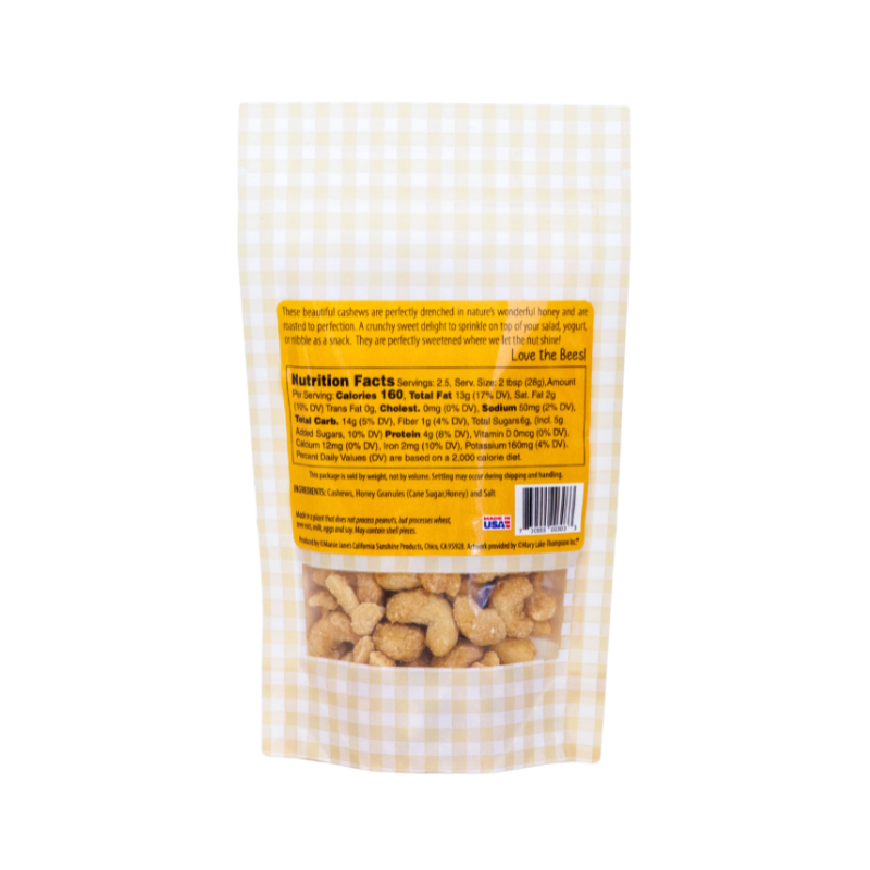 - Roasted & Flavored Nuts (Made at Maisie Jane’s): Produced in our Chico, CA facility, which does not process peanuts. However, these products are made in a plant that also processes tree nuts, milk, eggs, and soy. May contain shell pieces.
