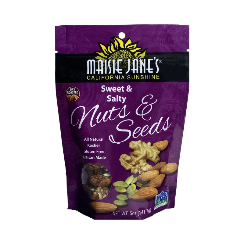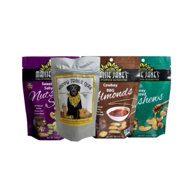 - Roasted & Flavored Nuts (Made at Maisie Jane’s): Produced in our Chico, CA facility, which does not process peanuts. However, these products are made in a plant that also processes tree nuts, milk, eggs, and soy. May contain shell pieces.